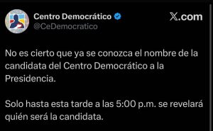 El Partido Centro Democrático realizará hoy lunes 15 de diciembre, a las 5:00 p. m., el anuncio oficial de su candidata presidencial para las elecciones de 2026, tras la encuesta interna que definió al único aspirante de la colectividad. Hasta ese momento, se conocerá formalmente el nombre de quien liderará la campaña del partido de derecha.