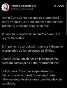 Ley de Garantías y contratación directa: Valencia solicita la suspensión de los decretos que, según advierte, flexibilizan la contratación directa en el marco de la Ley de Garantías, permitiendo un uso discrecional de los recursos públicos en plena contienda electoral.