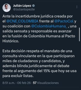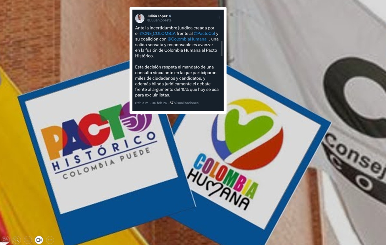 López señaló que “una salida sensata y responsable es avanzar en la fusión de Colombia Humana al Pacto Histórico”, argumentando que esta medida permitiría blindar jurídicamente a los dos partidos y garantizar su participación en los próximos procesos electorales.