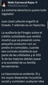 “Engañó al Estado”, afirmó la congresista, quien además denunció lo que calificó como “hipocresía” de algunos sectores que —según dijo— critican la intervención estatal, pero al mismo tiempo se benefician de subsidios y apoyos gubernamentales.