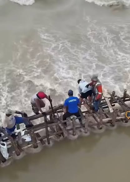 Sobre la frágil estructura, organizada en cadena humana, los hombres avanzaban uno a uno clavando pilotes y asegurando la contención mientras la corriente golpeaba con fuerza. Cada movimiento representaba un riesgo, pero también un acto de determinación colectiva.