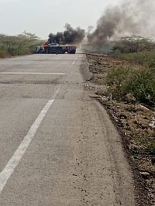 Guerrilleros del ELN atacaron a disparos una tractomula en la vía que comunica Cuatro Vías con Uribia, en el departamento de La Guajira. Posteriormente, el vehículo fue incinerado y en el lugar fue dejada una bandera del grupo armado junto a un cilindro que contendría explosivos.