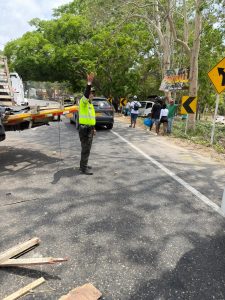 Falla mecánica provocó volcamiento de tractocamión en la Troncal de Occidente; uniformados de Tránsito y Transporte actuaron de inmediato.