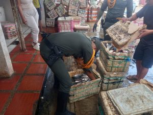 Durante los operativos, los uniformados recorren plazas de mercado y puntos de venta, verificando el estado del pescado, las condiciones de almacenamiento y el cumplimiento de normas sanitarias por parte de los comerciantes.