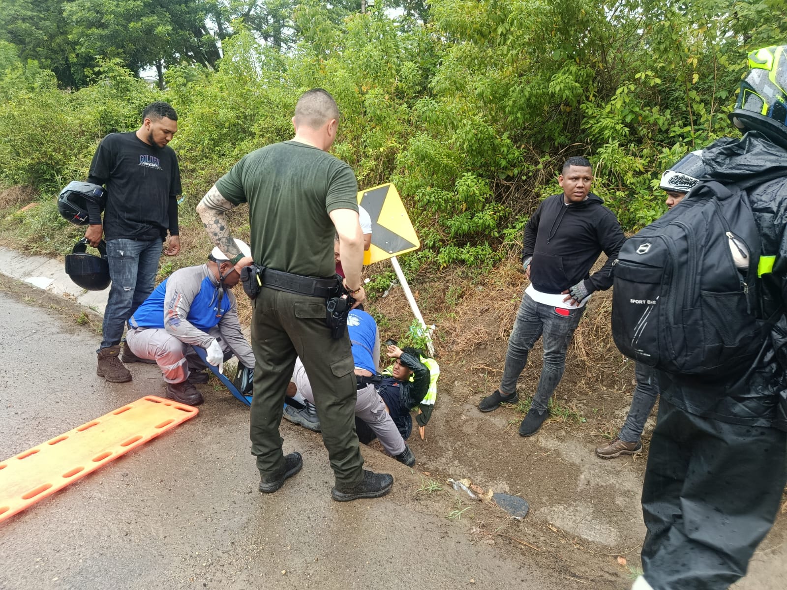 El uniformado se quitó su camisa para protegerlo de la lluvia mientras recibía atención tras perder el control de su motocicleta.