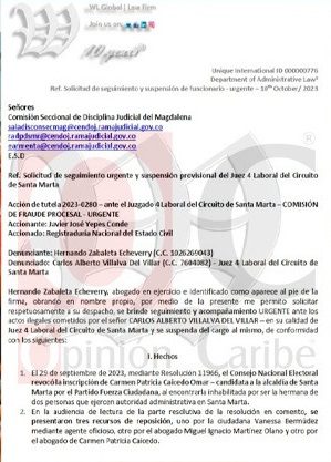 La denuncia se basa en un incidente ocurrido el pasado 9 de octubre de 2023, cuando el juez Carlos Alberto Villalva Del Villar emitió una controvertida decisión relacionada con una tutela en contra de la Registraduría, una entidad de orden nacional. Según el abogado Zabaleta, el juez al parecer actuó sin tener competencia para avocar el conocimiento de esta tutela y sin integrar al contradictorio al Consejo Nacional Electoral. Además, según el denunciante, no se notificó a las partes que lograron la revocatoria de la inscripción de la candidatura de Carmen Patricia Caicedo, a pesar de existir 70 acciones de tutela idénticas repartidas ante el Tribunal Superior del Magdalena – Sala Laboral.