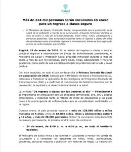 El Ministerio de Salud y Protección Social proyecta vacunar durante el mes de enero a más de 234.000 personas, entre niños, niñas, adolescentes y mujeres gestantes, como parte de la Primera Jornada Nacional de Vacunación de 2026 y de la estrategia Regreso a Clases Seguro.
