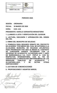 El Concejo de Soledad aprobó este lunes la prórroga por seis meses del contrato de concesión con la empresa Triple A, que continuará prestando los servicios de acueducto y alcantarillado en el municipio.